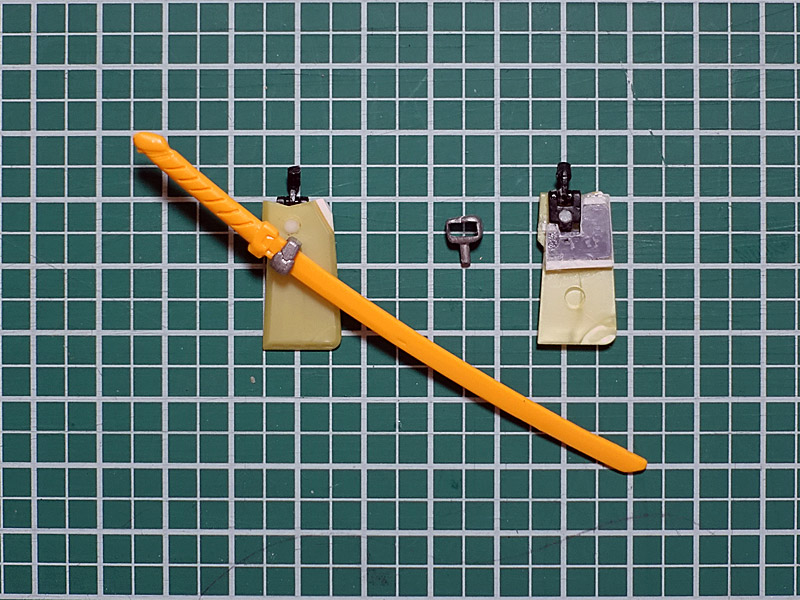 スカートアーマーに剣(柄と鞘)を取り付けていなかったことに気付きました。ポリキャップのランナータグ部分(バンダイ製キットの物が柔らかめで良い)をプラ角棒とプラ板で挟むようにしてスカート裏側から固定し、1.5mm径の穴を開けてレジンキット付属のメタルパーツを差し込めるようにしました。剣はプラ製の方を使用します(レジンバーツは反っているので)。