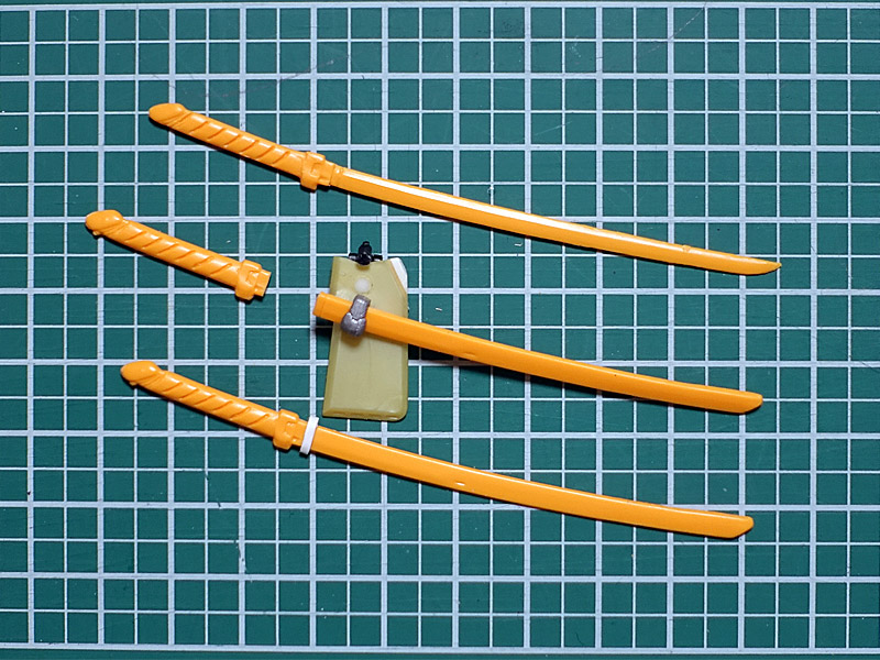 剣を柄と鞘に切り分けたところ、鞘だけを装着したときに鞘がずり落ちることが判明。思案の末、鯉口(鞘の入り口)にあるモールドを拡大解釈して太らせることにしました。1mm幅で切り出したケント紙(プラ材は接着剤を付けた瞬間ひび割れしてしまい使用できず)を瞬間接着剤で止めながら2周巻き付けました。