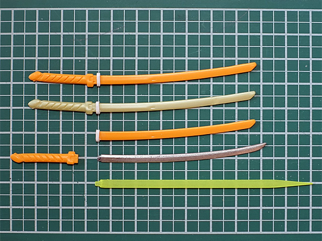 ハリボテ制作がようやく一段落しました。鯉口にケント紙を巻いた剣を計3本準備。アトキでジュノールodkに剣を投げ渡したシーンがカッコ良かったので1本余計に作ったのですが、よく考えたらジュノールodkは在庫していなかった...光剣の刃と実剣の刀身を、柄に取り付けられるように微調整しました。剣の部品は潤沢にあるのですが、手首が少ないので刃のみ交換可能にしています。