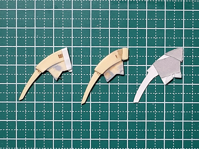切り貼りしたボール紙(向かって右)を見ながらレジンパーツを調整(中央)。接続部分を切り離すと真っすぐ再接着するのが困難に思えたので、分割はせずに下端の角度と長さを調整しました。内部のモールドを残すため、インテーク?はやや長めに切り離しています。今更ながら、このパーツに左右の別があることが判明(凹モールド5本の面が外側、4本の面が内側、らしい)。多分ヤスリ掛けで消えてしまうので気にしない方向で。