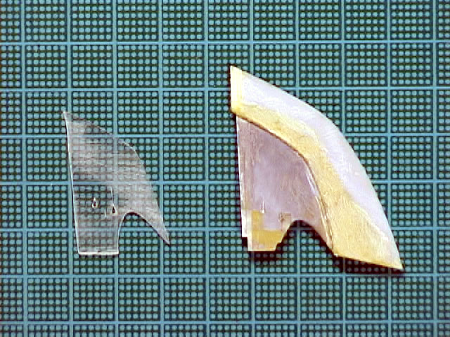 仮組写真の度に情けない姿を晒していたカウンターウェイトの工作を開始。右から順に、EDキット(ノーマルパーツ),型紙,本番パーツ。プラキットのパーツの後端のエッジ部分を出来るだけ活かして下方向にエポキシパテやプラ材で延長しています。本番パーツの手前にある透明な物はゲージです。 |