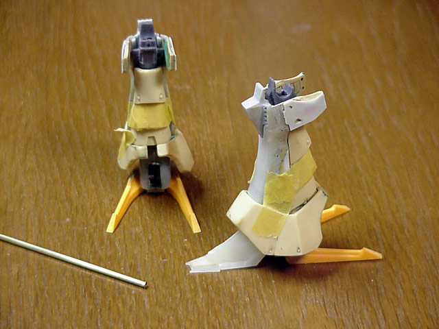 ヒザ周り装甲板断面の形状修正をほぼ完了、以前検討を保留していたヒザ関節を後ろからカバーする装甲板を再度検討することにしました。ヒンジパーツに5mm幅のプラ板を仮止めし、イレーザーエンジン上端裏側を削り込んでこの装甲板が逃げる隙間を確保してみました。しかし、装甲板の形状からしてここへ逃がすのには無理がありそうです。