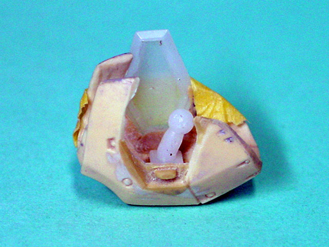 肩アーマーの取り付け位置確認。試験的に右肩のみ接続してみました(左肩は被せただけ)。元キットの凹部に軸径2mmのプラ製ボールジョイント軸を切り詰めて(軸長8mm)固定してみました。その際軸への負担を少なくする為、先に軸先を肩アーマーに差し込んでからボールをはめ込んでいますが、強度的に若干不安があります。