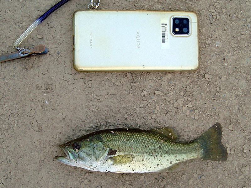 前回と比べて水量が少なく、いつものポイントは底が見える状態。10m程上流のコンクリート橋の脇に魚影が有ったのでその近辺を探りました。途中中型の